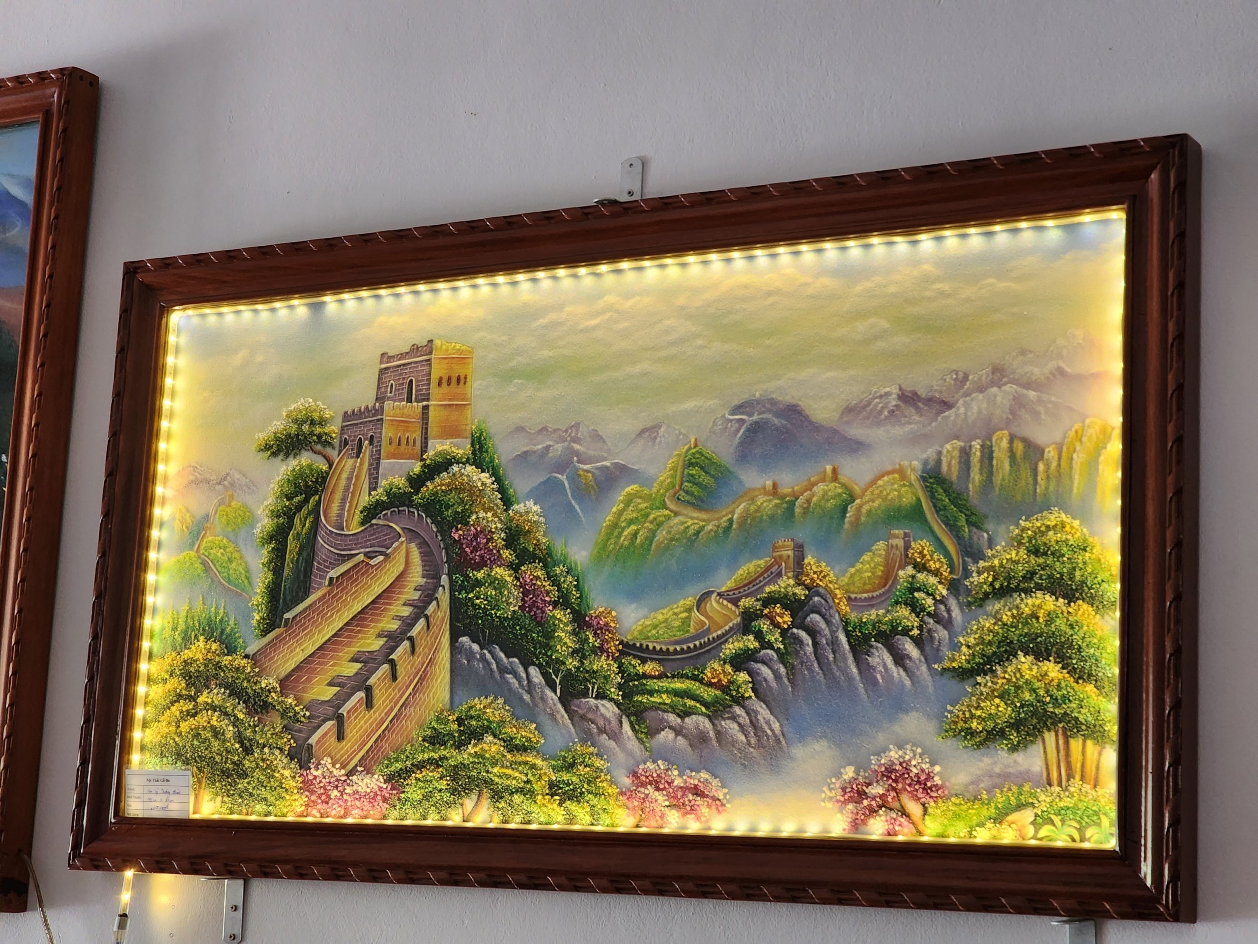 Những dãy núi trùng trùng điệp điệp đội trên mình dải mây trắng xóa, ánh mặt trời đỏ rực nhuộm màu rừng cây xanh ngắt, những thác nước đổ òa xuống như một dải lụa hòa cùng tiếng chim muông ồn ã. Tất cả tạo nên bức tranh Sơn thủy hữu tình kì vĩ, đẹp đến nao lòng. Là bức tranh treo tường phong cảnh thiên nhiên nhưng lại hữu tình và đầy thi vị.